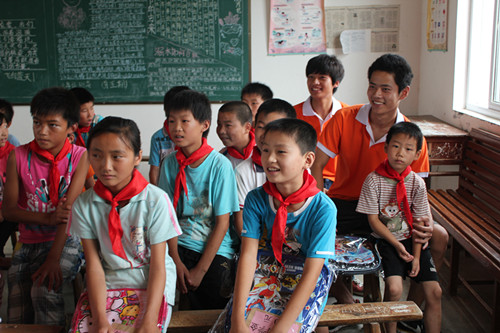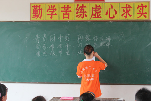 教室里,30多个孩子带着红领巾整整齐齐坐在教室里。穿着不那么华丽,却还算整洁得体,课桌很破旧,孩子们却挺直了腰杆,认真的听着城里来的大学生姐姐给他们上课。他们大声而又整齐的朗读起来,别看他们有的个小,声音却丝毫不逊色,学起诗来真带劲。在教室旁听的其他大学生志愿者们由衷的感动,为小朋友们鼓掌,既是对他们聪明才智的赞美,更是被他们的热情、好学的精神所感染。