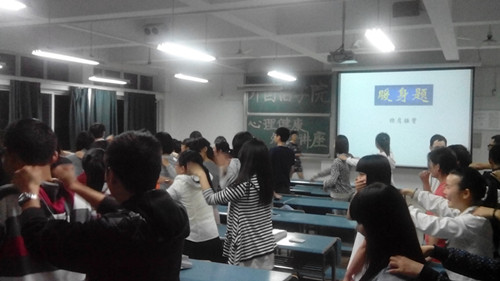 倪青先给学生出了暖身题,即让同学们给左右的同学“揉肩捶背”,放松了同学们的身心,活跃了全场气氛。随即倪青老师提出“什么是快乐?”让学生讨论,进而向同学们解释快乐的意义,以及同学们之所以会感到不快乐的原因。最后倪老师告诉同学们如何保持快乐,即将能力、理想、兴趣爱好等日常生活与学习协调一致,创造出快乐的最高境界。她还指出,积极是一种力量,年轻的大学生们要以积极的态度面对生活,相互传递正能量,快乐生活,快乐学习。倪老师深入浅出,采用同学们喜闻乐见的方式,帮助学生拨云见日。