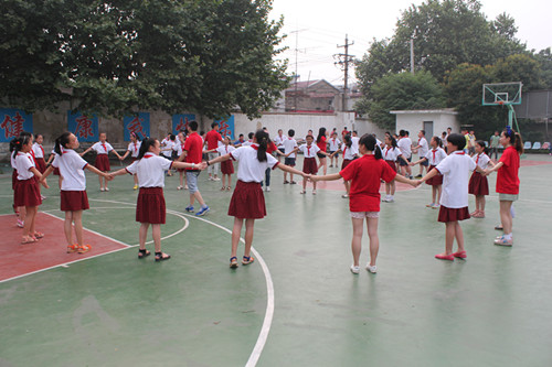 最后,志愿者们还带领着小朋友们走出教室,走入操场,开展了户外素质拓展活动,四人蹲、七人抱等精彩有趣的小游戏,让大手拉小手,笑容在青年和少年的脸上绽放,正能量在大学生与小学生之间传递。