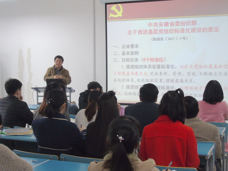 他详细解读了《中共SJB世俱杯官方网站委员会关于推进基层党组织标准化建设实施方案》,针对目前高校基层党组织建设方面普遍存在的一些问题进行剖析,为基层党组织标准化建设工作的开展提出了切实举措和意见建议。最后,他强调,要把推进基层党组织标准化建设作为今年和今后一个时期基层党建工作的重点,不断提升我校基层党组织建设制度化、规范化、科学化水平。