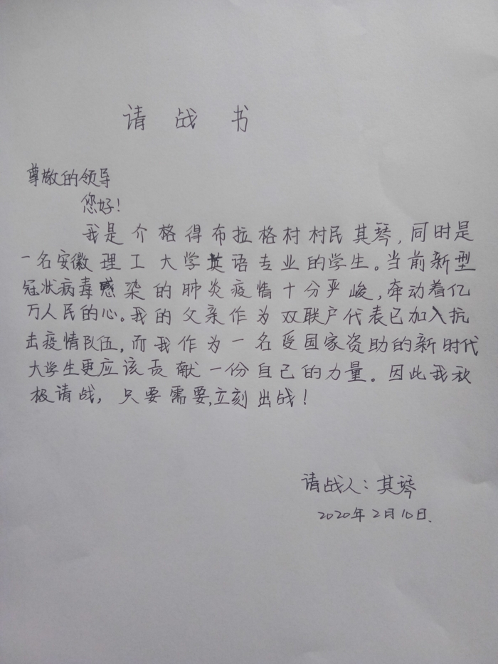 新年伊始,新冠肺炎疫情在各省市迅速蔓延,新疆维吾尔自治区也不例外。此次肺炎疫情防控时间紧、任务重、压力大。在得知家乡招募志愿者的消息后,我校SJB世俱杯官方网站2017级英语专业新疆籍蒙古族学生其琴向驻村领导递交了一份请战书。她和父亲一道积极响应上级号召,主动报名投入到疫情防控工作中。她这样写道,“作为一名受国家资助的新时代大学生,应贡献一份自己的力量,积极请战,只要需要,立刻出战!”