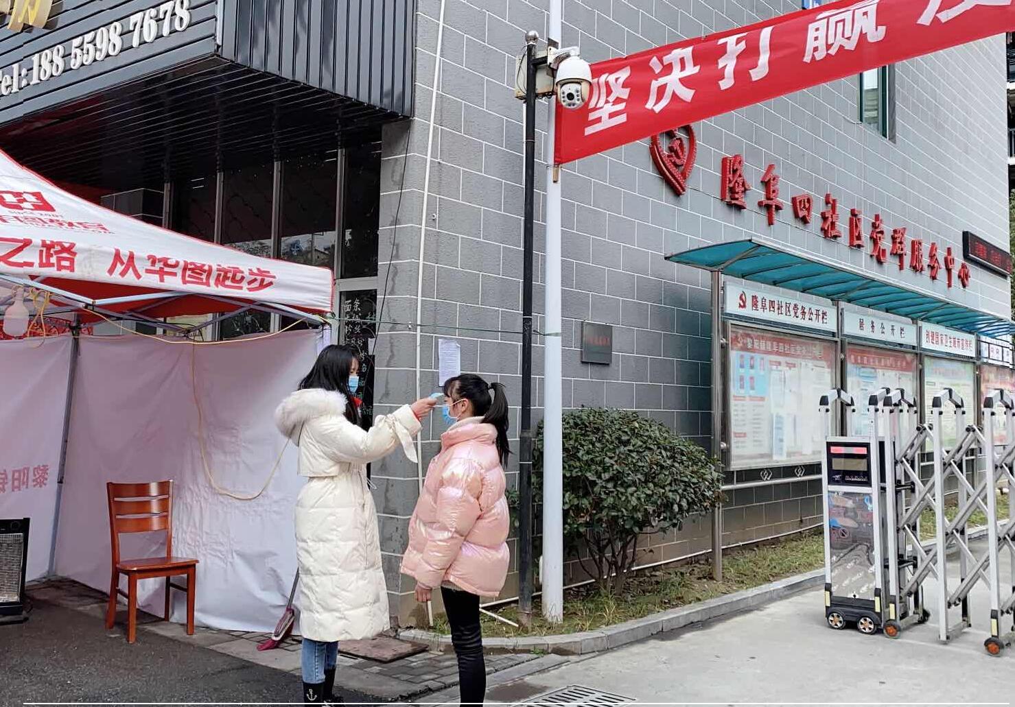 彭庄琪同学在为出入社区的居民测量体温(摄影:彭庄琪同学提供)