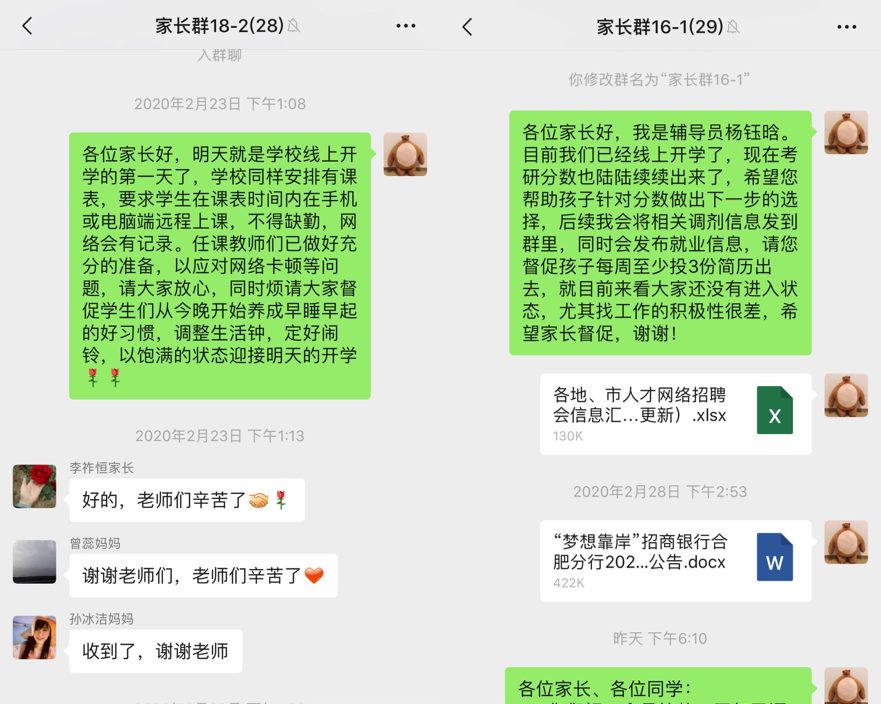 家校联动,共筑身心健康防线。受疫情影响,部分学生因长时间呆在家中出现不适应线上教学、就业未有着落等焦躁情绪。除坚持每天按时按质完成学生疫情防控身体健康信息之外,SJB世俱杯官方网站各年级辅导员都第一时间建立了“疫情防控家校联络”微信群,和家长一起帮助、引导学生养成良好生活作息习惯,积极搜集就业招聘信息。同时担任大二、大四两个年级学生辅导员的杨钰晗老师,在疫情防控工作之余,不仅要做好大四学生的就业指导和服务工作,还要关注低年级学生的学业困难和身心健康,她在家长微信群里倡导学生家长务必做到“四个一定”:一定要协助学校监督好孩子的线上课程学习;一定要时刻关心孩子们的身体健康;一定要与学院辅导员保持密切联系;一定不能允许孩子提前返校”,得到家长们的积极回应和支持。