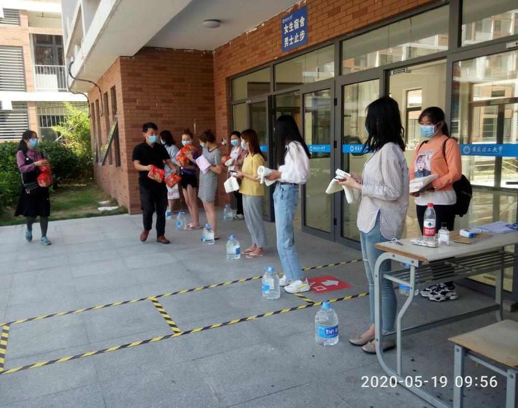 19日上午,正在宿舍自习的英语2016级袁梦同学、日语2016级黄哲同学分别接到了辅导员的突然来电:“赶快带上口罩下楼,学院几位教职工党员来公寓看你们啦!”作为疫情防控期间一次特殊的主题党日活动,考虑到返校学生封闭管理的要求,SJB世俱杯官方网站学生党支部的4位在职教职工党员分别前往爱苑B栋、信苑C栋公寓楼为15位返校学生送去了毛巾、风油精、方便面、桶装纯净水、牛奶等生活用品,第一时间送到了公寓楼门口,传递全院教师对他们的关爱,鼓励他们专心在公寓内学习复习,消除顾虑,增强信心,迎接考试。“学校老师们对我们真好,又回到久违的校园见到学院的几位老师真的很开心!大学四年校园生活转瞬即逝,真得越来越不舍得离开这里。”英语2016级汪晨同学激动地说。“当前我国疫情有所好转,社会各界复工复查也在有条不紊的进行中,作为新时代“后浪”更应当积极响应国家号召积极就业,贡献自己的力量。”从四川返回学校的英语2016级王悦琦同学说。还有不少同学们纷纷在QQ空间、朋友圈和大学圈发表自己的返校感受,热情地表达对学校精心组织和学院亲切关爱的感谢之情。