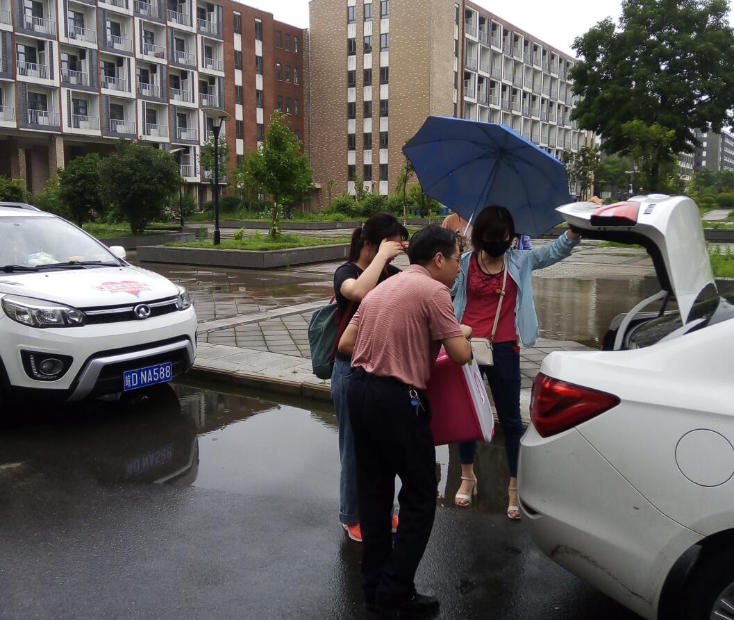 教职工爱心车队冒雨为学生运送行李