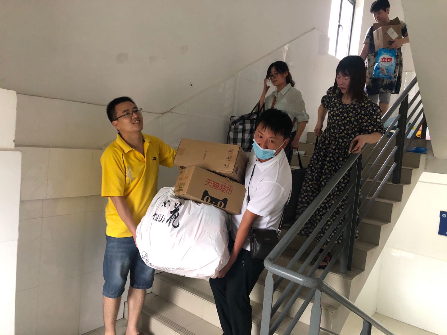 老师们帮助楼层高的女生搬运行李