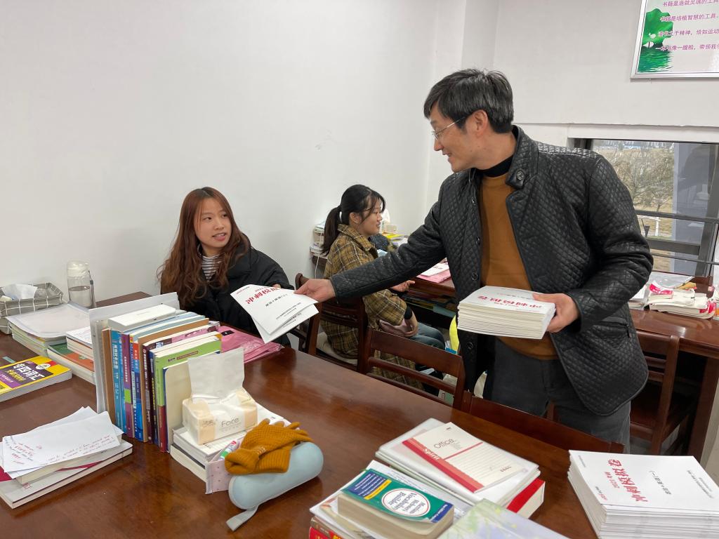 学院党委书记张宣传给学生发冲刺卷(摄影:秦镇)