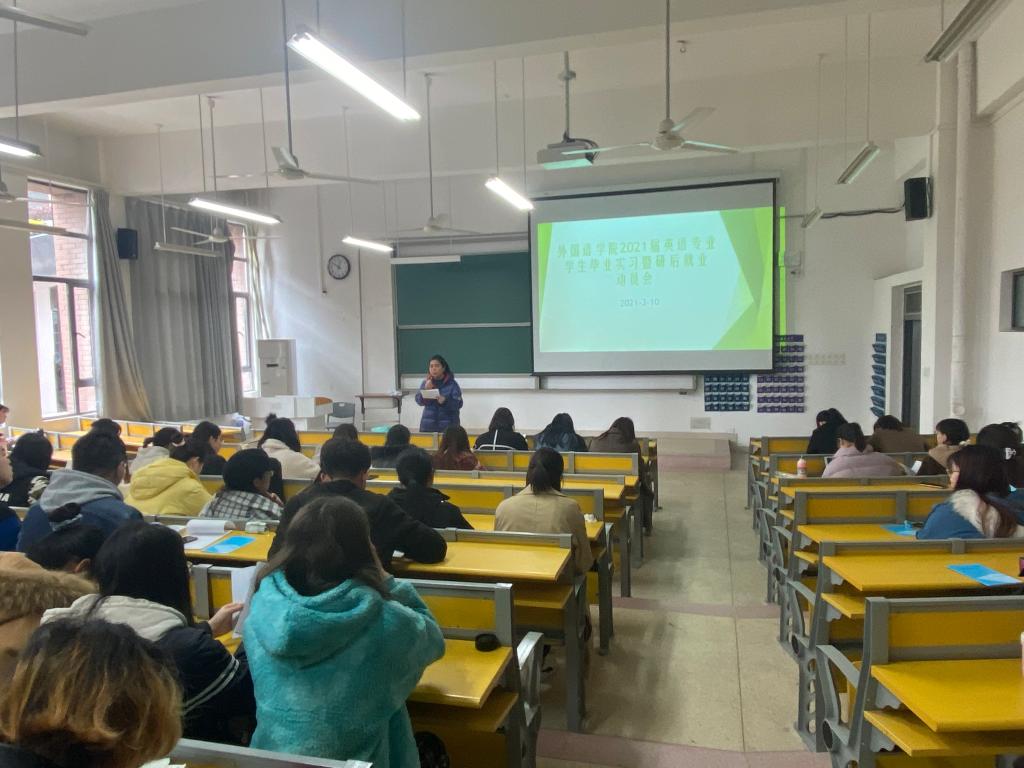 3月10日上午,为了使2021届毕业生能在返校后进入学习状态,SJB世俱杯官方网站在明理北110召开2021届学生毕业实习暨研后就业动员会。大会由学院党委副书记兼行政副院长彭晶主持,英语系主任应伟伟、毕业班辅导员和全体2021届毕业生参加大会。