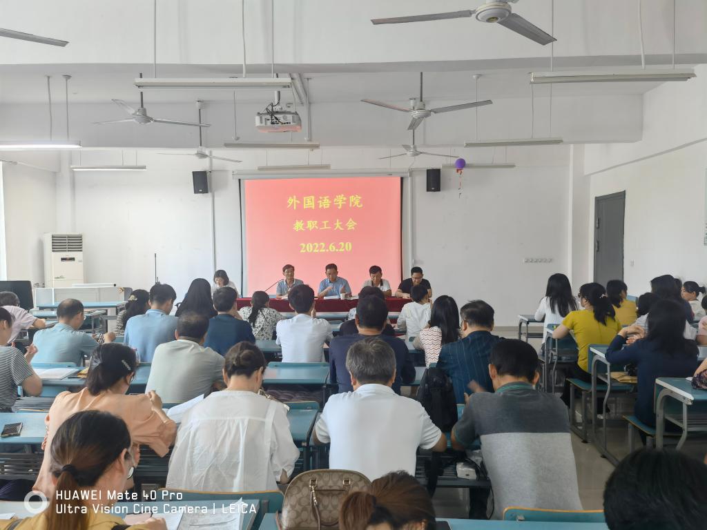 王宗华就本学期疫情防控、学科专业建设、研究生教育培养、师资队伍建设和科研工作等方面取得的标志性成果作总结,并对暑期工作进行了部署。他强调,学院英语专业获批国家“一流专业”是在全体师生员工的共同努力下取得的喜人成果,全体教职工应当再接再厉,再创辉煌;同时,他希望全体教职工合理规划好暑期工作和生活,多学习交流,及时“充电”,争取在教学水平和科研能力上取得新的突破。