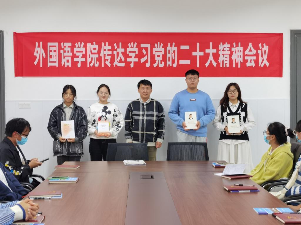 参会学生现场交流了学习感悟。英语21-3班詹晨辰说:“作为一名新时代青年,我们见证了中国走向‘强起来’的十年。在未来的工作和学习中,我将用实际行动贯彻落实党的二十大精神,刻苦学习、接续奋斗,发挥好榜样带头作用。”英语22-4班胡燕凤说:“我们作为强国一代,亲眼见证了党团结带领全国各族人民打赢脱贫攻坚战、全面建成小康社会、经济总量稳居世界第二位等一系列标志性成果。我们对全面建成社会主义现代化强国充满信心!”参会的学生还获赠了学院学生第二党支部和院团委赠送的《习近平谈治国理政》第三卷、第四卷(英文版)等学习书籍和笔记本。
