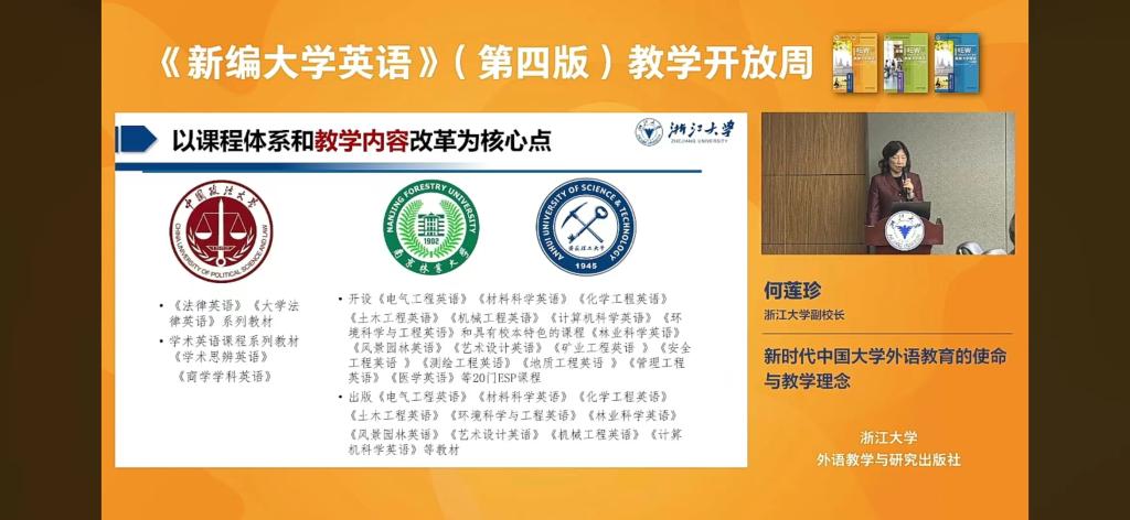 会上,何莲珍做了题为《新时代中国大学外语教育的使命和教学理念》的主旨报告。报告强调,要加强大学英语课程体系建设校际合作,并高度评价我校ESP课程体系与教材建设成果,重点介绍我校大学英语课程体系改革与实践探索。