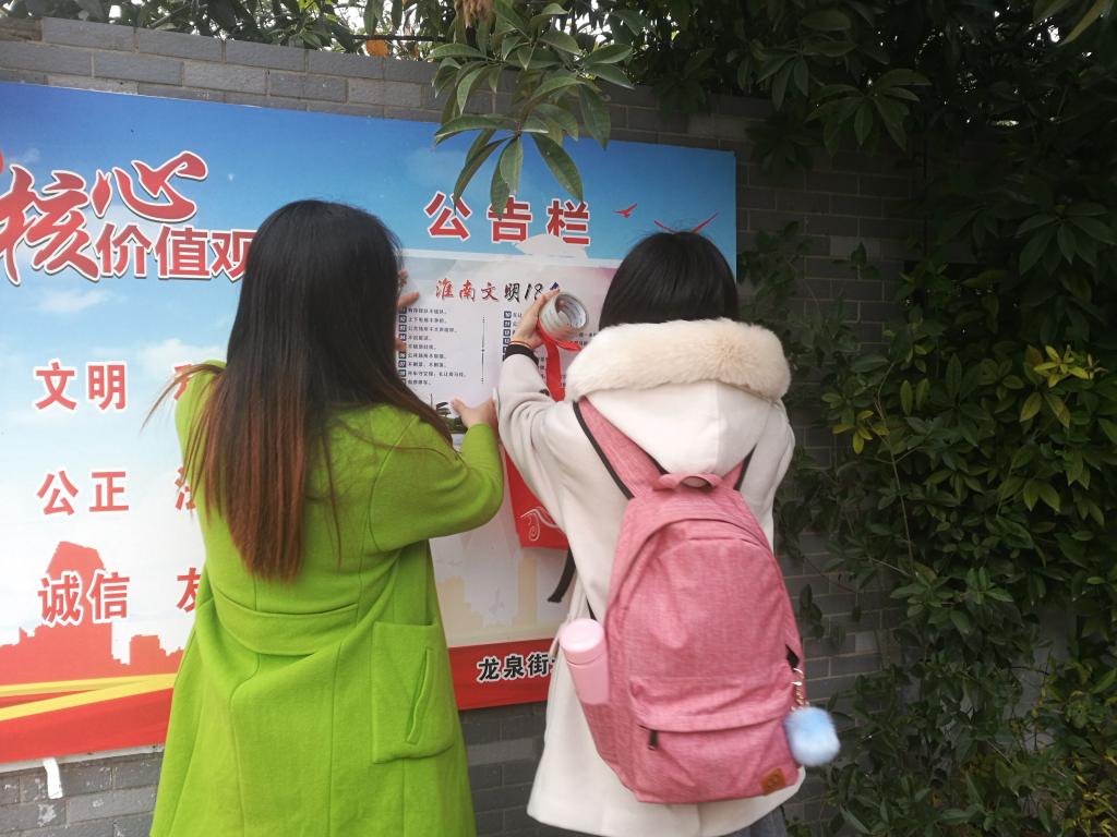 在南岭社区,志愿者们有序地分成了四组,在社区公告栏上张贴了淮南市创城办发布的《创建全国文明城市 共建美丽幸福家园——致广大市民的一封信》、《淮南文明18条》和《淮南市社区(新建社区)、校区创建标准》等海报30余张、传单300余份,并在一些社区居民中进行了政策宣讲。很多居民都夸赞志愿者们的这次活动,表示他们将会积极支持社区精神文明创建,向社区负责人和有关部门建言献策。