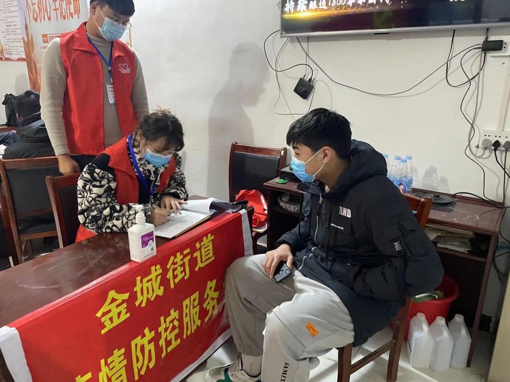 志愿者在社区协助登记省外返乡人员信息(摄影:华嫣然)