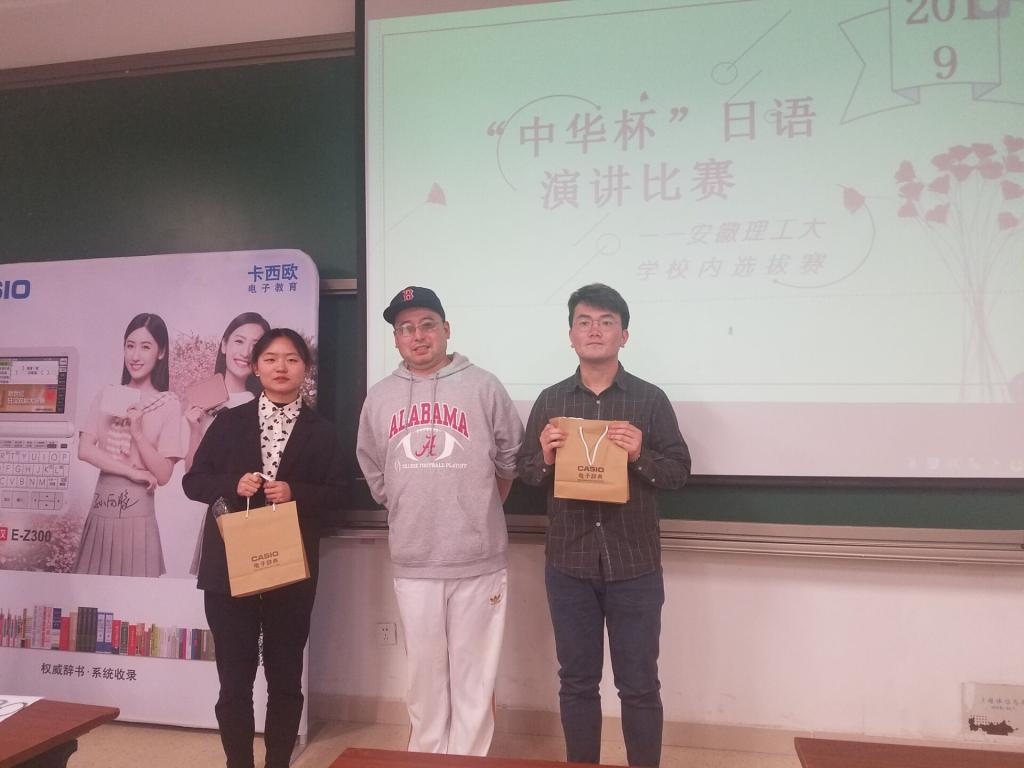 出席活动并担任评委的有日语系主任朱亚青等五名日语老师和活动奖品卡西欧电子词典赞助商。此次比赛采取脱稿演讲的形式,十分考验选手日语水平。比赛开始,九位选手抽签决定比赛顺序。参赛选手日语功底深厚,演讲十分精彩,台下掌声不断,尤其是四号选手凤帆同学的演讲令人称绝。经过一系列激动人心的比拼,最终,凤帆荣获一等奖,谢磊、范萌获二等奖。