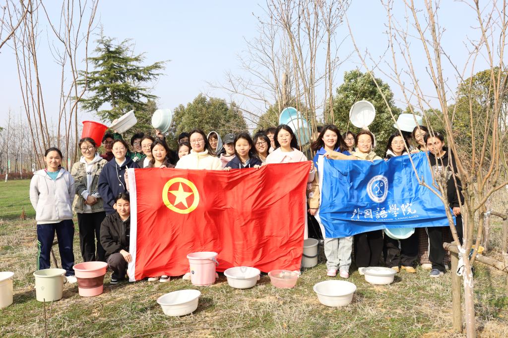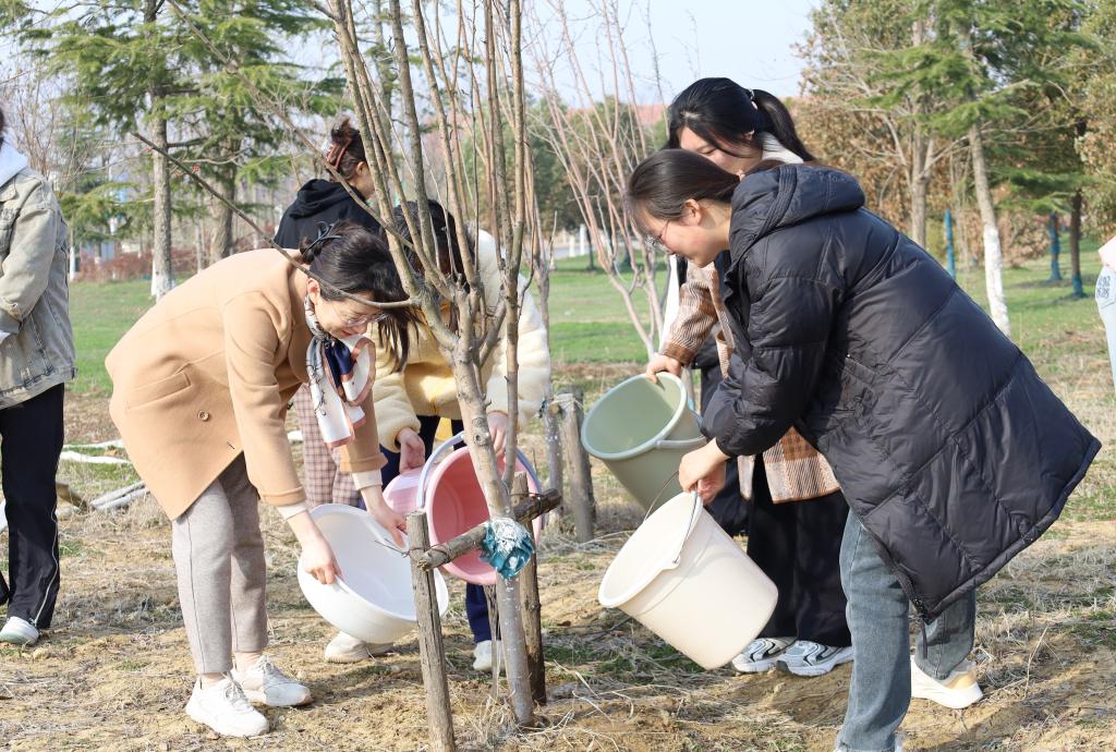 修枝、松土、围堰、运水、浇水……活动现场一派热火朝天的劳动景象,师生每三人结成一个植树小组,分工协作、干劲十足,以实际行动践行绿水青山就是金山银山的绿色发展理念。来自23级英语4班的新疆籍新生克丽比努尔·麦麦提敏说道:“我积极融入班集体活动,在劳动过程中我不仅获得了快乐,更加感受到同学之间互帮互助的真情,祝福大家都能像这树苗一样在春风的沐浴下茁壮成长。”