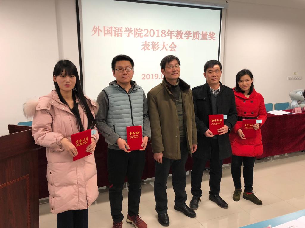 本次大会主要对在2018年度学院青年教师讲课比赛和学生网络评教成绩两方面表现突出的教师分别进行表彰。在2018年度学院青年教师讲课比赛中,共有11位教师获奖,程仲老师荣获一等奖,朱乔、周宁、梁颖老师荣获二等奖,王化菊等7位老师荣获三等奖。学院特聘教授陈纪梁为11位获奖老师颁发了获奖证书和奖金。根据本学年两学期的学生网络测评成绩平均得分排序,共有5位教师位居全院前列,日语系张楠老师获一等奖,公外一系张静静老师获二等奖,英语系王化菊老师、公外二系教师陈少彬、陈岳红老师获三等奖。学院党委书记张宣传为获奖教师颁发了获奖证书和奖金。
