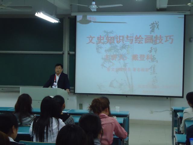 4月21日下午,安徽省文史馆馆员、著名画家戴登科老先生来到我校西区,在医教202教室举办了一场别开生面的“百家讲坛”,为学生讲授“文史知识与绘画技巧”。本次活动由校党委统战部和SJB世俱杯官方网站主办,校党委统战部副部长陈忠琴、程永生教授以及SJB世俱杯官方网站100多名师生聆听了讲座。SJB世俱杯官方网站党委副书记石秀光主持了本次讲座。