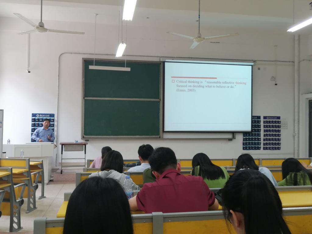 在题为“外语学习中的批判性思维”的学术报告中,詹全旺以中美贸易战(trade tensions)的翻译引入主题。报告着重探讨了critical的词源、定义和批判性思维的源头,用大量生动翔实的例子,深入浅出地分析了批判性思维的教育现状和如何在外语学习中锻炼批判性思维,并提出要在观察、分析、推理和评价中锻炼批判性思维能力。