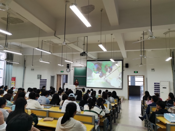 张菁女士在讲座中结合自己的翻译经历,围绕武侠小说的特点、阅读体验、角色塑造等内容,以郭靖,黄蓉,梅超风,杨过,小龙女等小说人物为例子,讲解分析了翻译作品实例,解释译者是如何解读原文文本,挖掘角色信息,为英译本重新塑造有血有肉的故事人物,并展示了翻译在传递原文内容时会带上具有主观性的写作阐释。讲座趣味十足,引人入胜。互动环节,学生踊跃提问,向张女士请教如何进行人物翻译、如何用英文地道表达语言、如何翻译才能使外国读者理解中国传统道德,文化特色等问题,张菁女士结合自己的翻译实践做出精彩回复,并鼓励英语专业的同学多阅读,多学习,多尝试,多体验,抓住时代机遇,加入到国际传播事业中,做好跨文化沟通的桥梁和纽带。