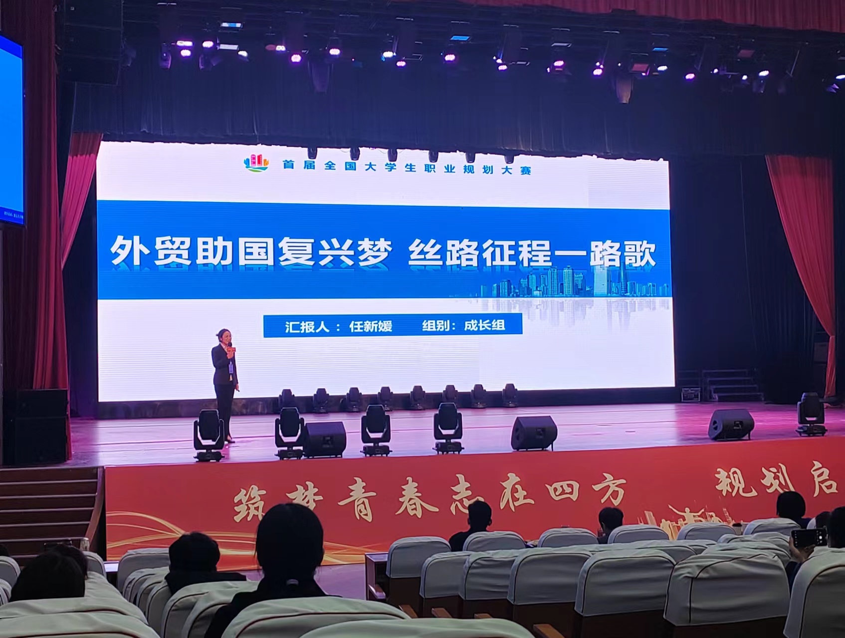 任新媛同学以《外贸助国复兴梦,丝路征程一路歌》为主题,结合当今“一带一路”倡议的大背景,运用职业测评工具、SWOT分析等多种方法详细地展示了自己大学生活的规划,并对未来发展之路做了思考和展望。她的表现受到了评委老师的一致赞赏,最终获得了一等奖(学校唯一)。